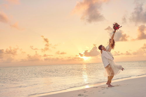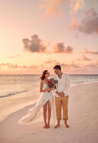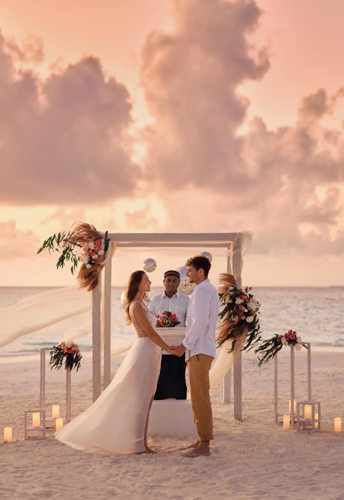 The Sandy Toes package provides couples with all the essentials for a timeless Maldivian ceremony. From a warm coconut welcome to vows exchanged at a beautifully adorned beach altar, this package delivers understated charm. Guests can toast their union with champagne, indulge in a two-tiered wedding cake, and relax with romantic in-room decor. Professional photographers capture every precious moment to treasure forever. Prices start from £1,280, plus taxes and fees.